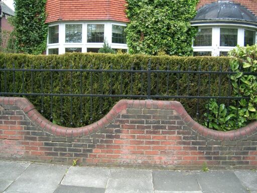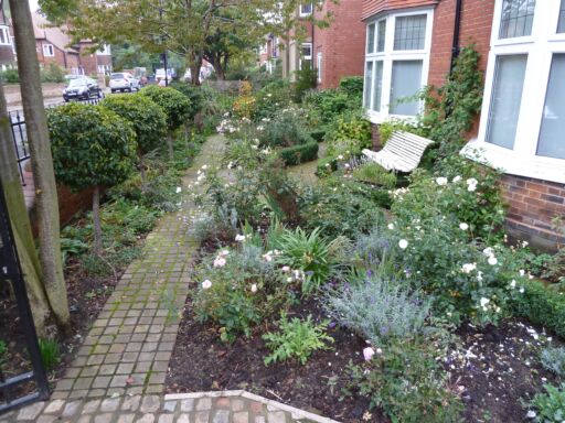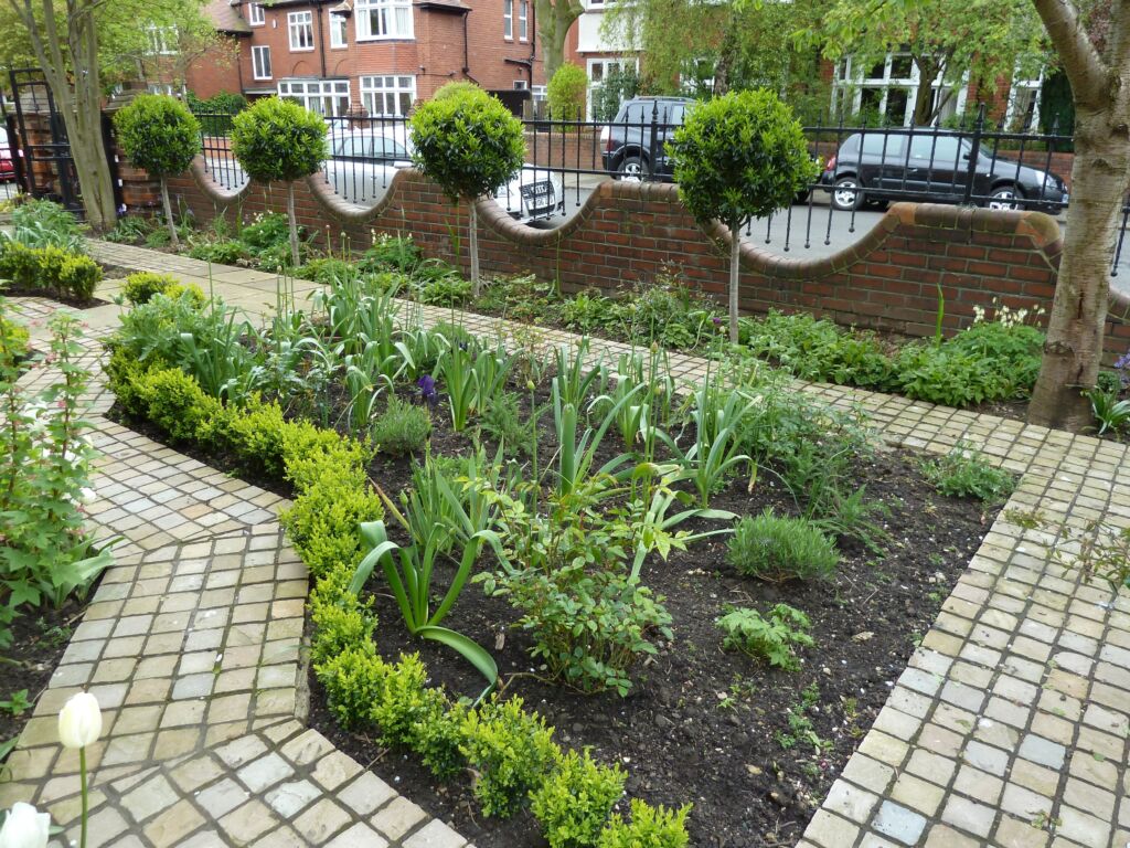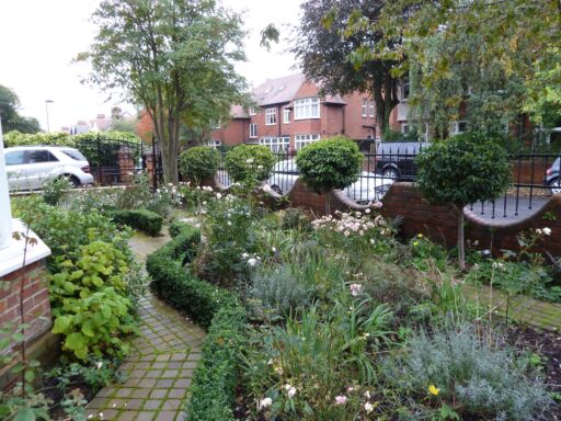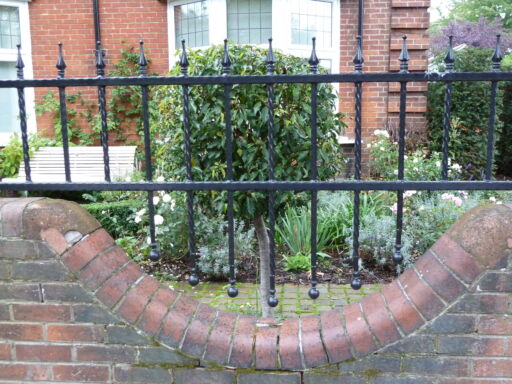 The scalloped wall and railings were highlighted with a standard Prunus lusitanica ‘Angustifolia’ in each dip and the planting palette was soft pink, blue, white and yellow, with box hedges for winter interest. The two trees in the corners have been retained and add much needed height.