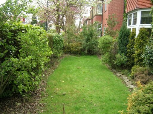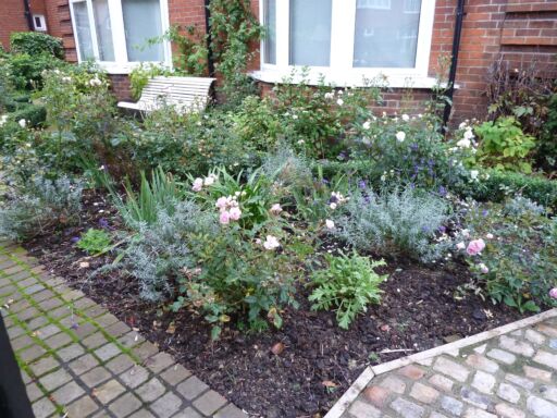 The little patch of lawn, overgrown evergreen plants and hedge were removed and replaced with cottage garden plants and a network of paved paths with a small seating area, facing south.
