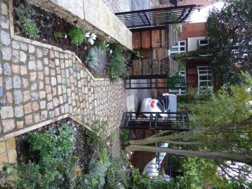 The paths form a circuit around the planting and create the illusion of more space. I have used small setts for the paths and larger stone paving slabs for the seating area which makes the tiny space feel more generous.