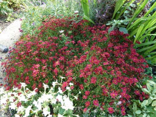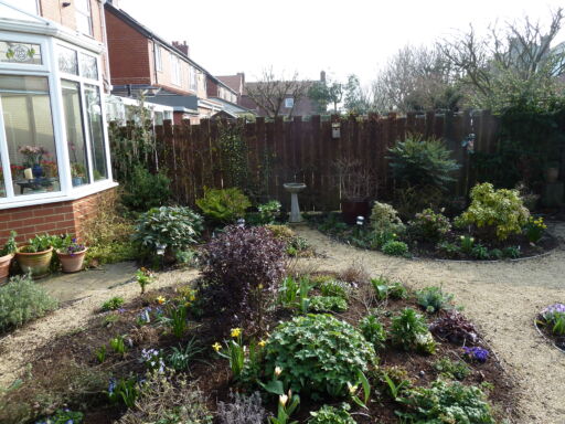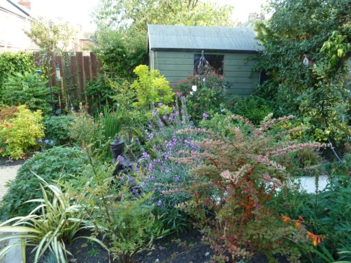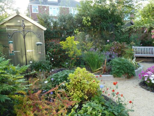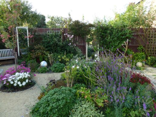 A shady corner has a mini-stumpery with ferns and Hostas amongst others while the rest of the garden gets plenty of sun and the colourful planting reflects that. Several climbers already on the fence were pruned and tied onto their supporting wires and a pair of mirrors have been fixed to the fence to extend the view of the paths and planting.