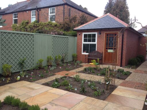 The fences were all changed and painted to match the doors of the house and garage. Trellis panels, some with mirrors behind, were used to add depth and texture. A planting palette of mainly blue, pink, crimson and white was used and the paving was a mixture of small setts on the paths with on-edge tiles at junctions as a nod to Lutyen’s style to promote movement through the beds and then larger stone paving slabs are used at the sunny end for a seating area.
