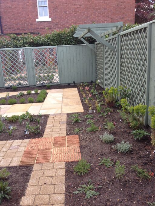 A patch of lawn and a selection of different fence types, a garage that needed to be replaced and tired paving were the starting point. The brief was to have a pretty area with room for entertaining friends, plenty of colour but reasonably low maintenance which looks good all through the year.