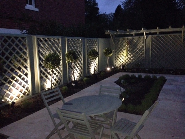 Lighting at the seating end highlights the trellis and standard bay trees and makes the garden look magical at night which is important in our long northern winters.