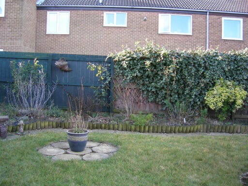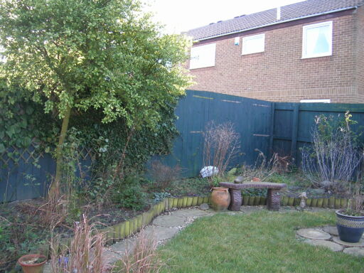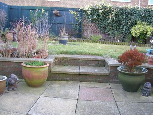 A little bubble fountain set in slate in a semi-enclosed seating area is approached via a pergola and a more open terrace has a café table and chairs in the morning sun. The central path leads from the conservatory to an arch at the top of the garden which is home to a mirror to reflect light and a view back into the garden and gives the illusion of the path extending further beyond the fence.