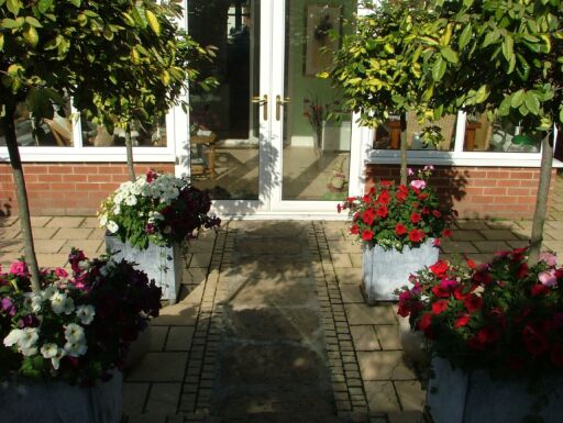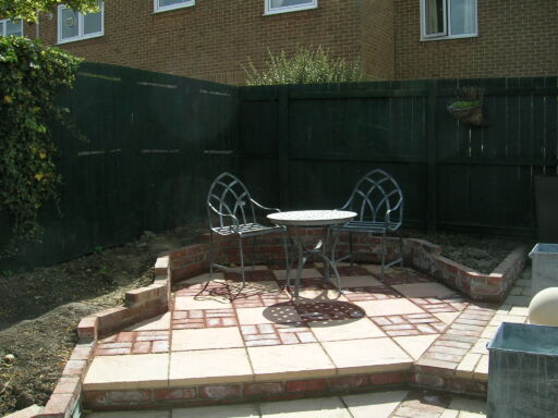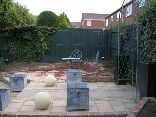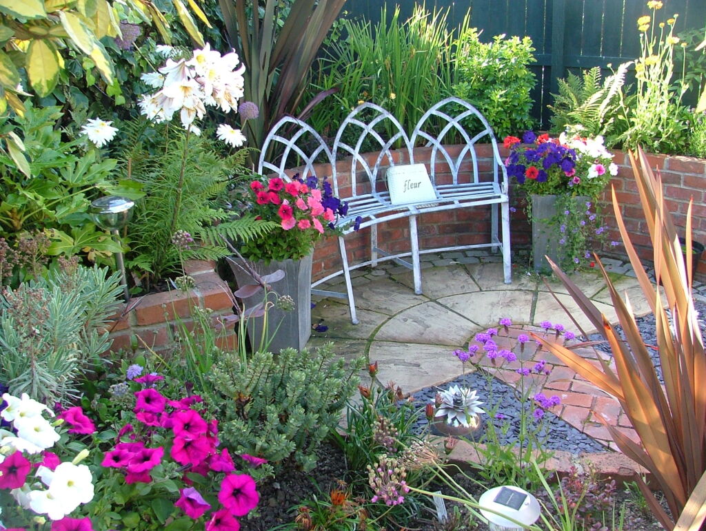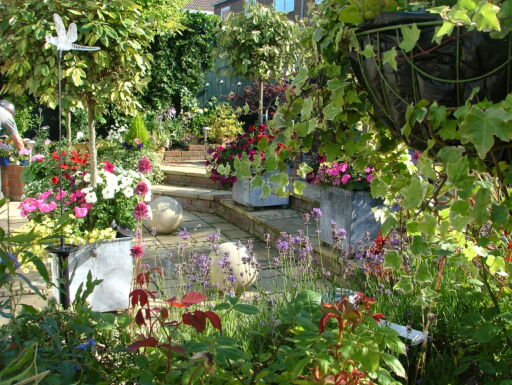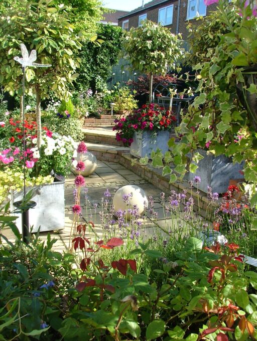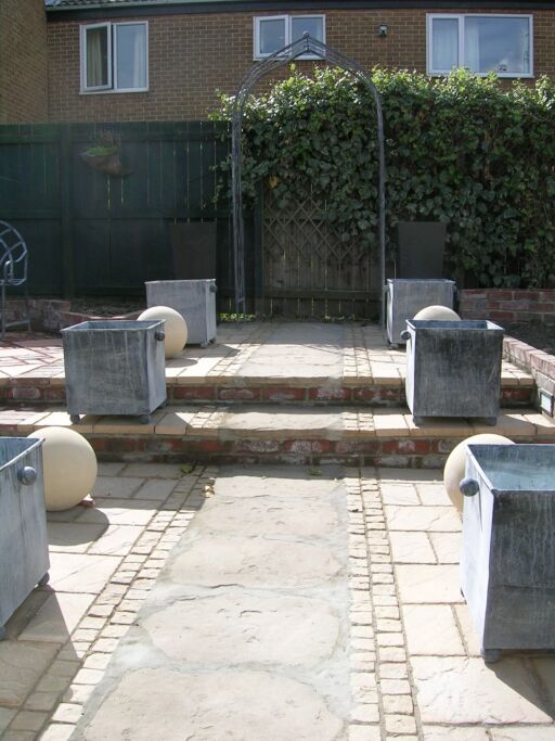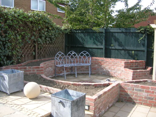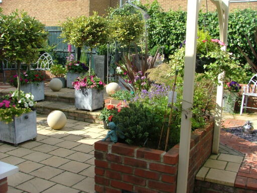 We moved the step to the higher level nearer the back fence thus giving more space for the conservatory. Brick for the raised beds of different heights blend with the house and some of the old paving was re-used and blended in with new, giving texture and colour variation. It has become a garden of parts within a small space. The planting is colourful and plentiful and the pots, arch, tables and seats are all made by the same firm with a galvanised finish for continuity.